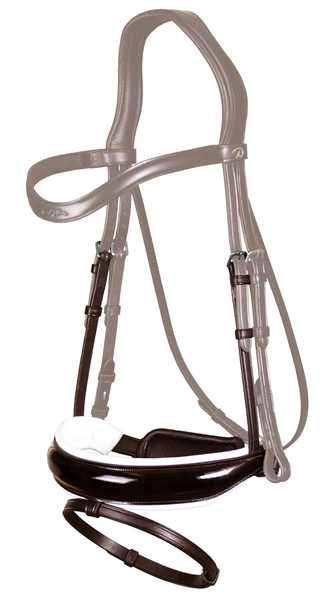 Szeroki lakierowany nachrapnik szwedzki z białym podszyciem ze skośnikiem Dy'on Dressage - brązowy