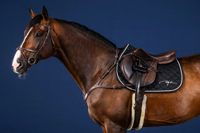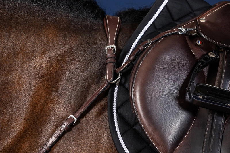 - Anatomiczny skórzany napierśnik Dy'on z kolekcji US Jumping. Kolekcja US Jumping charakteryzuje się kremowymi przeszyciami i srebrnymi okuciami. Mocowany do przystuł i siodła. Dostępny w kolorach: brązowym i czarnym.