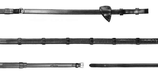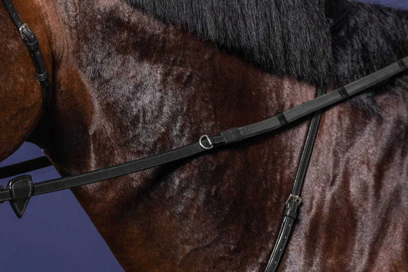 - Gumowe wodze Dy'on z 7 stoperami i dodatkowym kółeczkiem na środku z kolekcji New English. Kolekcja New English charakteryzuje się przeszyciami w kolorze skóry i srebrnymi okuciami.