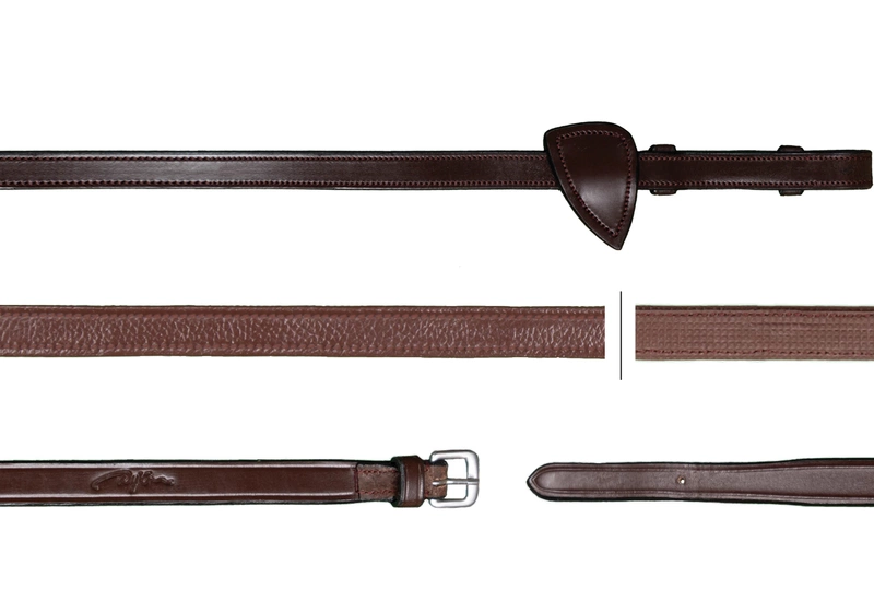 - Skórzano-gumowe wodze Dy'on bez stoperów z kolekcji New English. Kolekcja New English charakteryzuje się przeszyciami w kolorze skóry i srebrnymi okuciami.