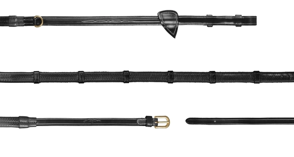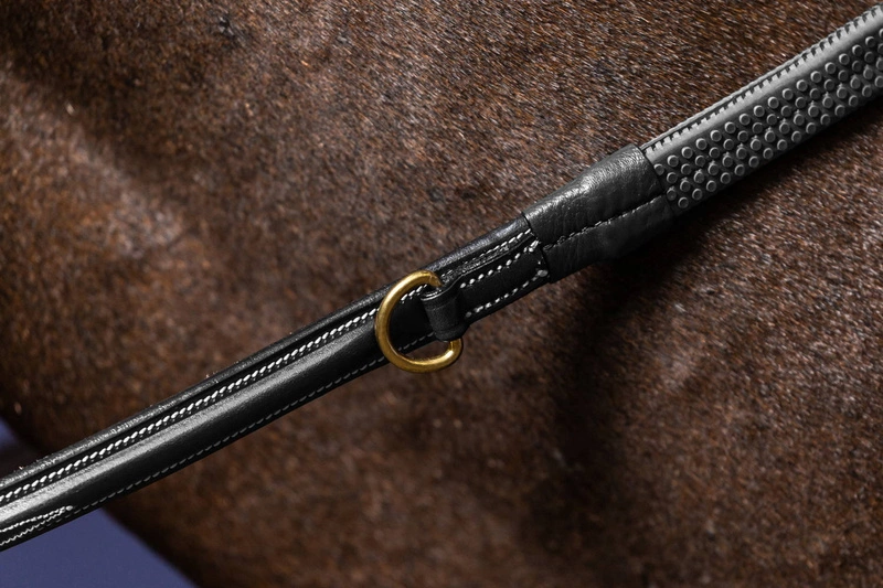 - Gumowe wodze Dy'on z 7 stoperami i dodatkowym kółeczkiem na środku z kolekcji D Collection. Kolekcja D Collection charakteryzuje się kremowymi przeszyciami i mosiężnymi okuciami.