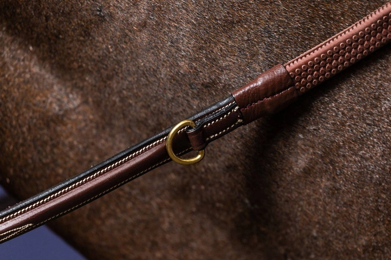 - Gumowe wodze Dy'on z 7 stoperami i dodatkowym kółeczkiem na środku z kolekcji D Collection. Kolekcja D Collection charakteryzuje się kremowymi przeszyciami i mosiężnymi okuciami.