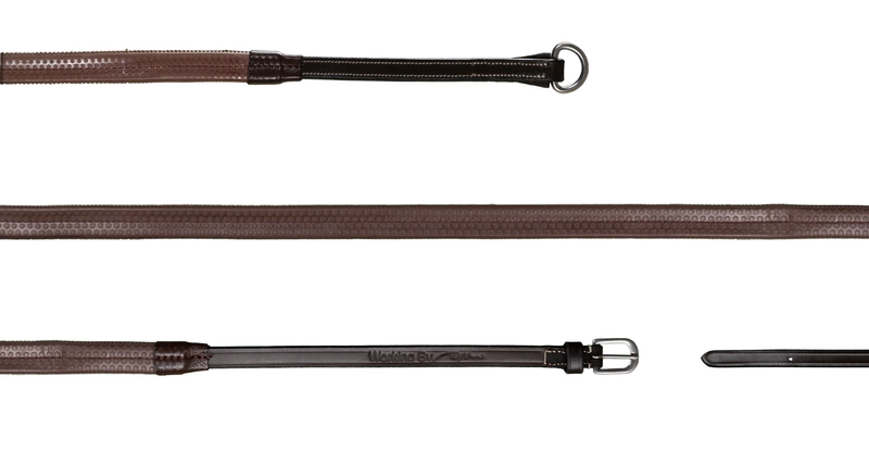 - Gumowe wodze bez stoperów Dy'on z kolekcji Working. Kolekcja Working charakteryzuje się kremowymi przeszyciami i srebrnymi okuciami. Wodze zakończone kółeczkami do przypięcia gogue.