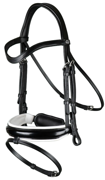 Ogłowie Dy'on z szerokim, lakierowanym nachrapnikiem szwedzkim z białym podszyciem Working - czarne