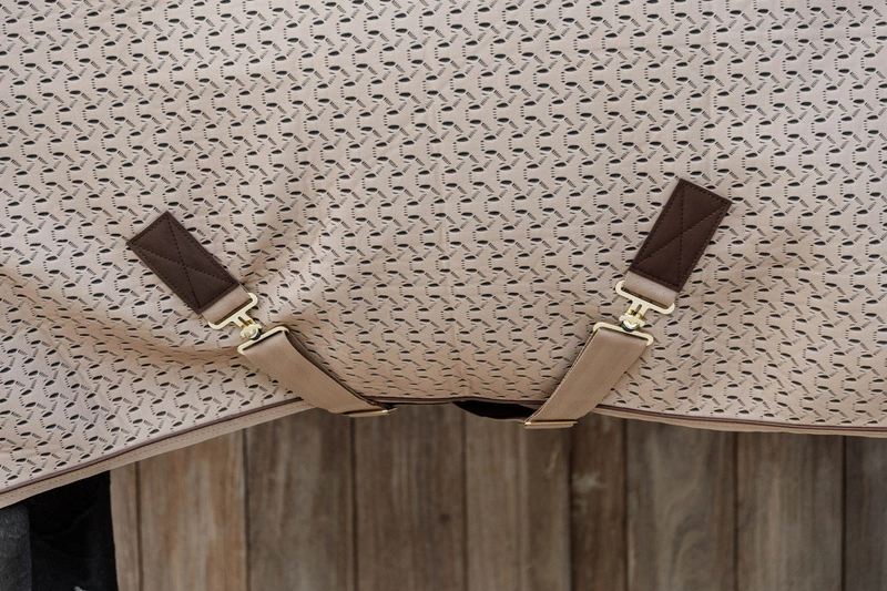 Derka ma podwójne przednie zapięcie i dwa pasy pod brzuchem wzmocnione sztuczną skórą.