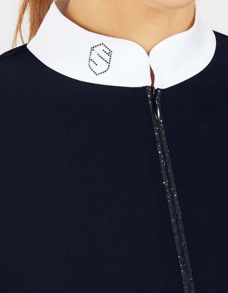 Koszula konkursowa jest zapinaną na zamek zdobiony połyskującymi drobinkami kryształków Swarovskiego.