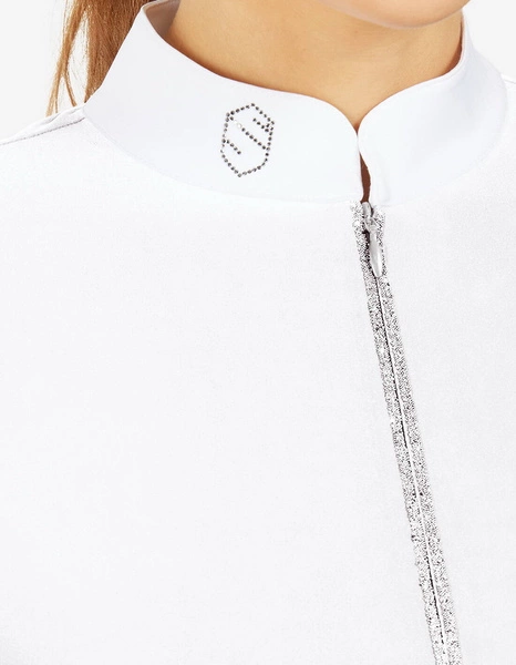 Koszula konkursowa jest zapinaną na zamek zdobiony połyskującymi drobinkami kryształków Swarovskiego.