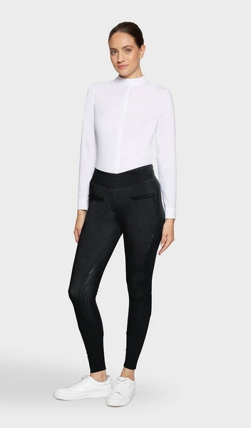 Szeroki pas w kształcie litery V nie tylko jest bardzo wygodny, ale również modeluje sylwetkę na brzuchu i zapewnia idealne dopasowanie bryczesów w każdych warunkach. Bryczesy mają wysoki stan.