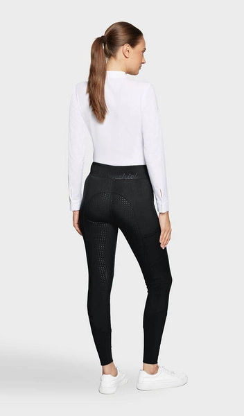 Ozdobione są subtelnym logo i napisem Samshield ułożonym z kryształków Swiarovskiego na lewym udzie. Kryształki mają kolor legginsów dzięki czemu dyskretnie się mienią.