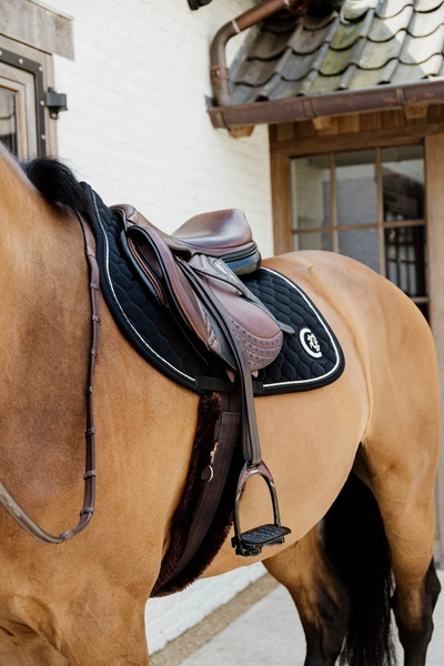 Anatomiczny kształt oraz szlufka do przełożenia popręgu gwarantują stabilne ułożenie na grzbiecie. Irytujące paski montowane do przystuł w przypadku czapraków Kentucky są zbędne.