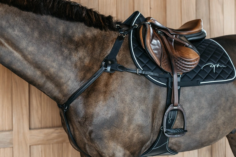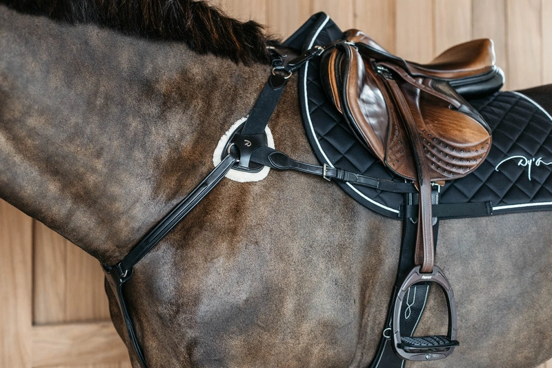 - Anatomiczny skórzany napierśnik Dy'on z kolekcji z kolekcji New English. Kolekcja New English charakteryzuje się przeszyciami w kolorze skóry i srebrnymi okuciami. Mocowany do przystuł i siodła. Dostępny w kolorach: brązowym i czarnym.