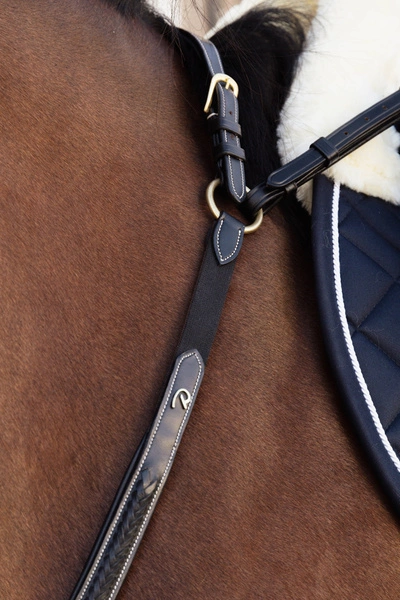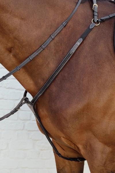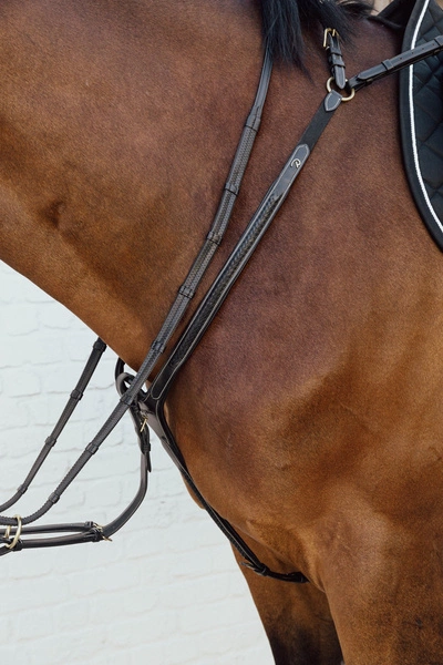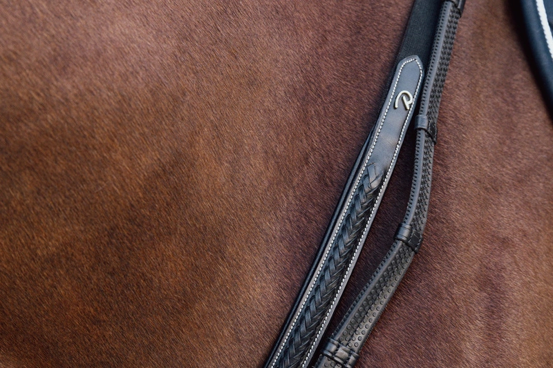 - Skórzany napierśnik z plecionką Dy'on Bridge Breastplate z kolekcji D Collection. Kolekcja D Collection charakteryzuje się kremowymi przeszyciami i mosiężnymi okuciami. Posiada gumowe wstawki o długości 6 cm. Dostępny w kolorach: brązowym i czarnym.
