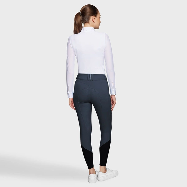 Tylna szlufka w całości pokryta jest kamieniami Swarovski. Poza tym ozdobione są haftem, z pisanym napisem Samshield, na lewym udzie. Ten subtelny haft również obsypany jest drobnymi, mieniącymi się w słońcu, kamieniami Swarovski. Haft i kamyczki są w kolorze bryczesów.