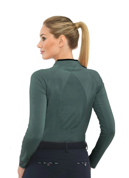 - Wyróżniają ją przewiewne, siateczkowe dodatki pod pachami i ułożone w łezkę na plecach oraz elegancka mini-stojka a'la kołnierzyk