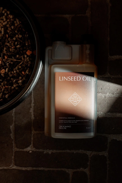 - Wysokiej jakości olej lniany tłoczony na zimno, bogaty w kwasy tłuszczowe omega-3..Poprawia połysk sierści i zdrowie skóry, ale także wspomaga trawienie, wspomaga kontrolę wagi i jest szczególnie korzystny w okresie linienia.