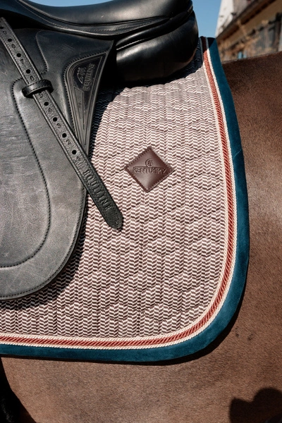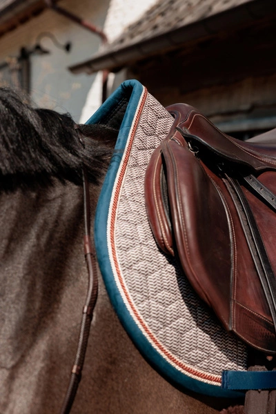 - Elegancki czaprak w klasyczną, modną jodełkę, ozdobiony sznureczkami i lamówką w kontrastowych kolorach.