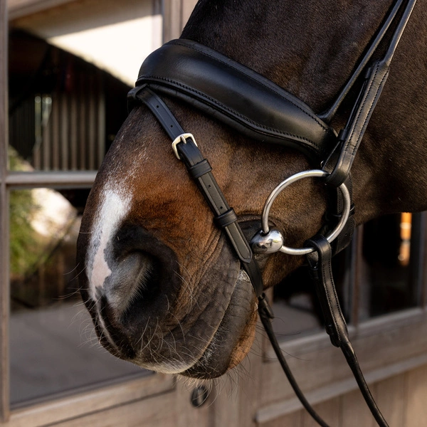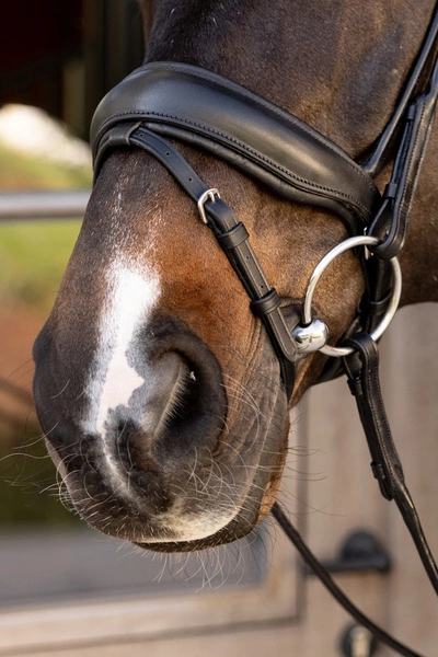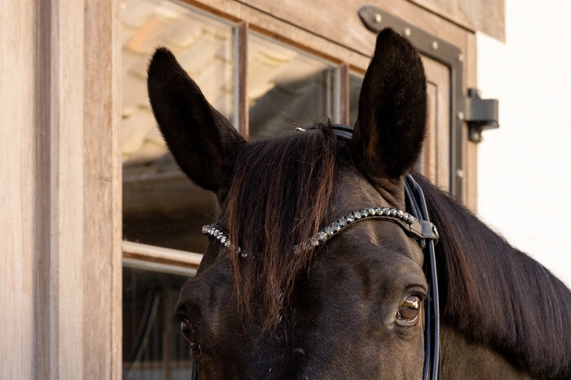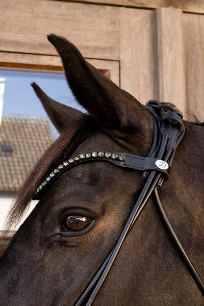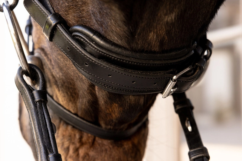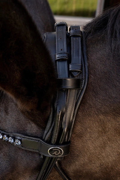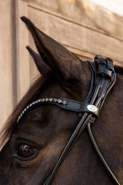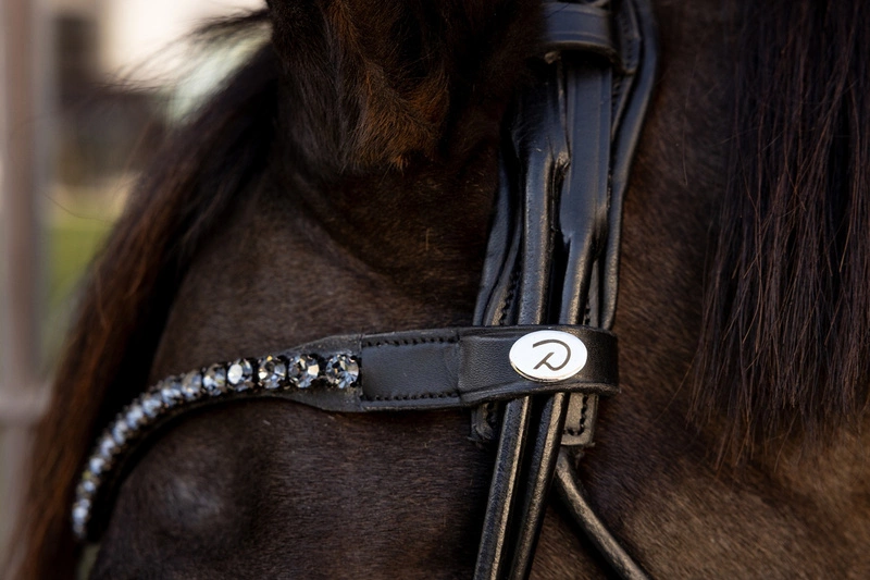 - Ogłowie z kolekcji Working. Kolekcja Working charakteryzuje się kremowymi przeszyciami i srebrnymi okuciami. Posiada opadający naczółek z kryształkami oraz z szeroki nachrapnik szwedzki. Dostępne w kolorze czarnym.