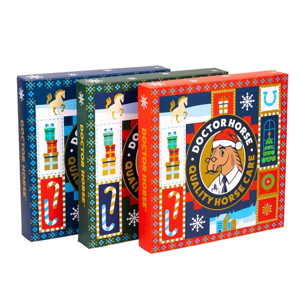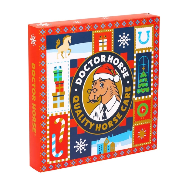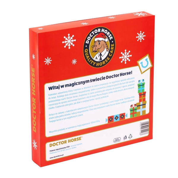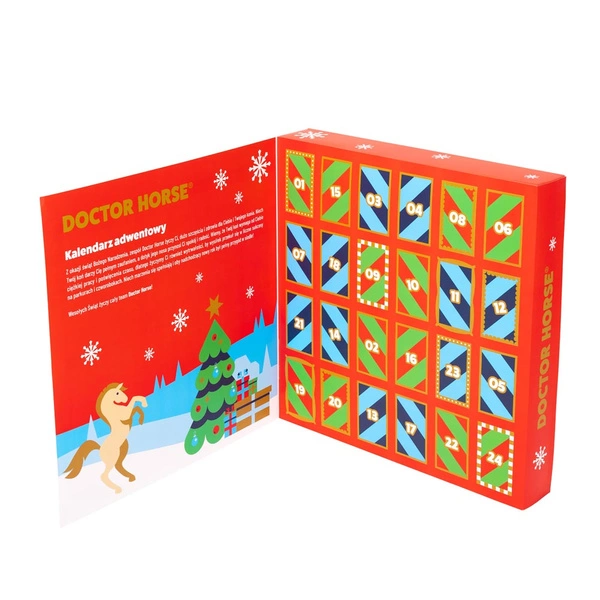 Za każdym z 24 okienek czeka niespodzianka: 13 produktów pielęgnacyjnych Doctor Horse w wersjach mini oraz 11 praktycznych gadżetów jeździeckich.
