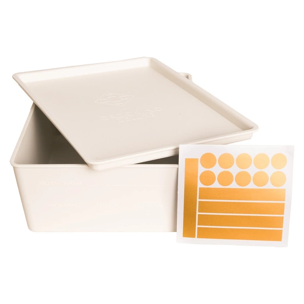 - Idealne do przygotowywania dziennych racji pokarmowych dla koni. W zestawie pokrywka, która chroni paszę przed kurzem i szkodnikami. W zestawie naklejki idealne do oznaczania imienia konia i pory karmienia. Dostępne w 4 kolorach.