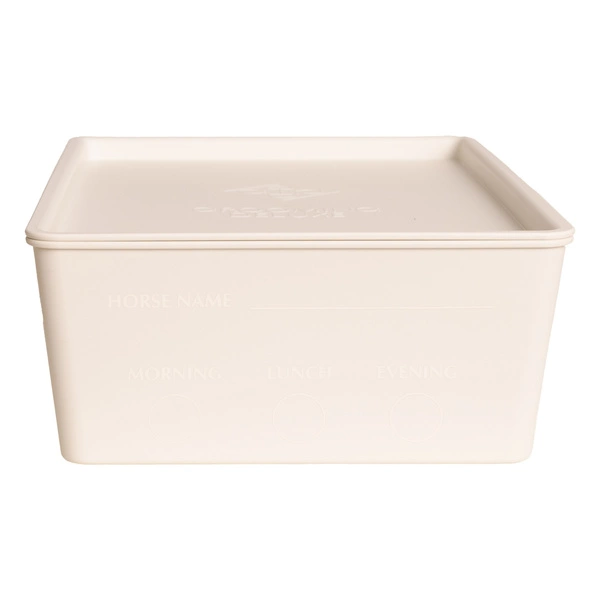 Wykonane z wytrzymałego, wysokiej jakości plastiku. Wygodny, przenośny rozmiar, idealny do użytku w stajni lub na zawodach. Pokrywę można łatwo zatrzasnąć. Dzięki naklejkom można łatwo dodać imię konia i wskazać rodzaj paszy.