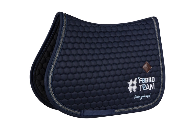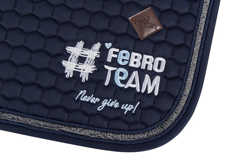 - Czaprak ozdobiony jest szeroką taśmą brokatową oraz haftem #FebroTeam z błękitnymi literkami "e", serduszkiem i podpisem "Never give up" z jednej strony i "Unstoppable" z drugiej.