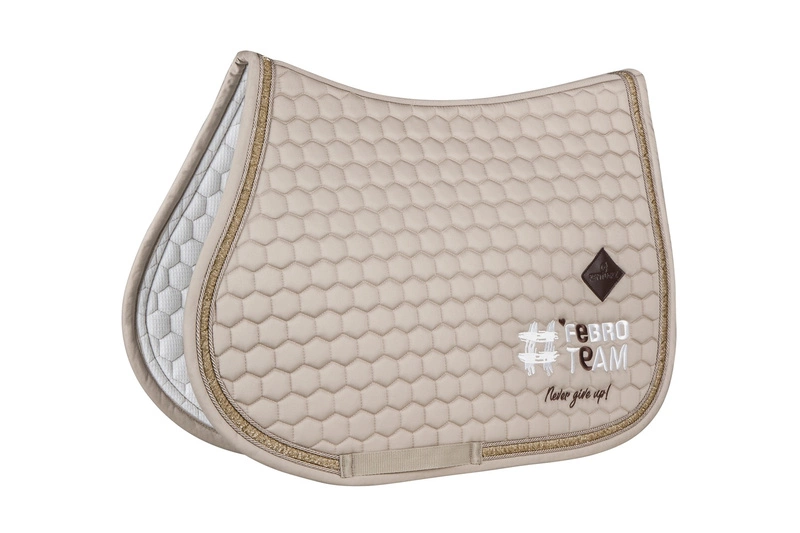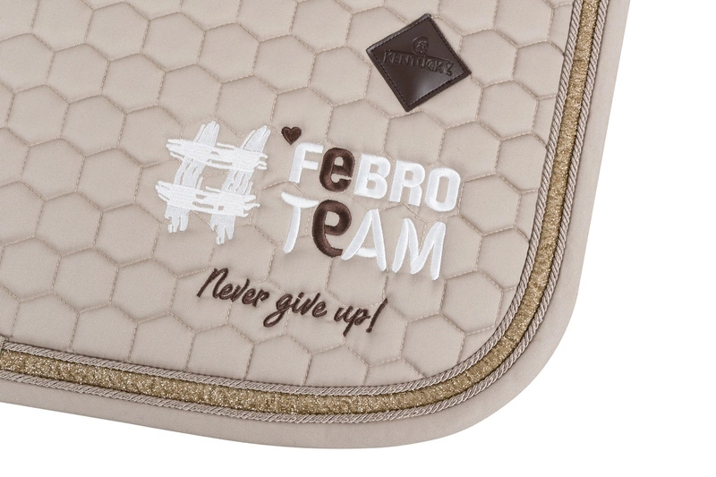 - Czaprak ozdobiony jest szeroką taśmą brokatową oraz haftem #FebroTeam z brązowymi literkami "e", serduszkiem i podpisem "Never give up" z jednej strony i "Unstoppable" z drugiej.