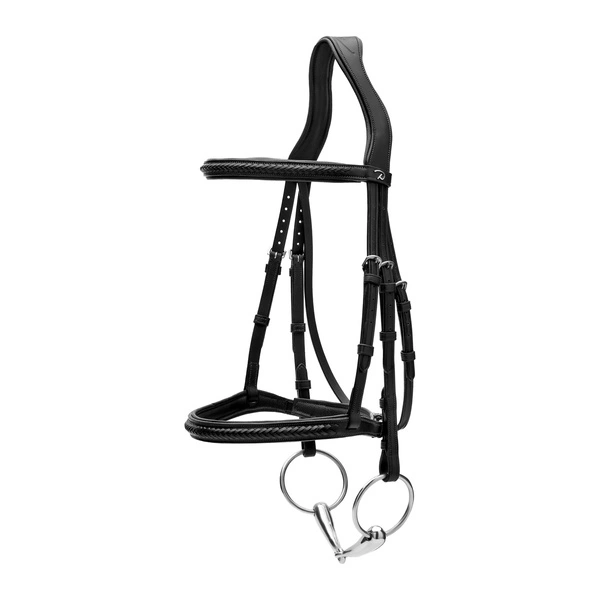 - Ogłowie Dy'on z nachrapnikiem angielskimz kolekcji New English. Kolekcja New English charakteryzuje się przeszyciami w kolorze skóry i srebrnymi okuciami. Posiada pleciony naczółek i nachrapnik. Dostępne w kolorze czarnym i brązowym.