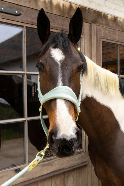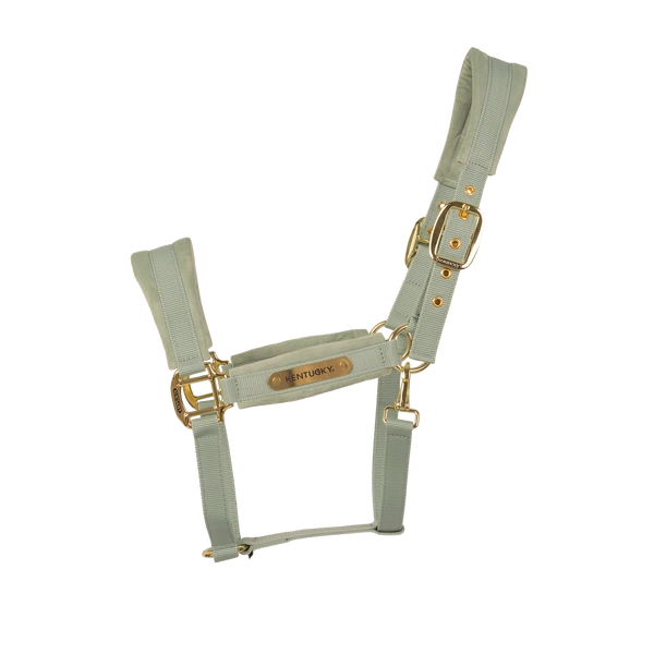 - Anatomiczny kantar Kentucky ozdobiony na nachrapniku i paskach policzkowych efektownymi, aksamitnymi dodatkami w kolorze kantara.
