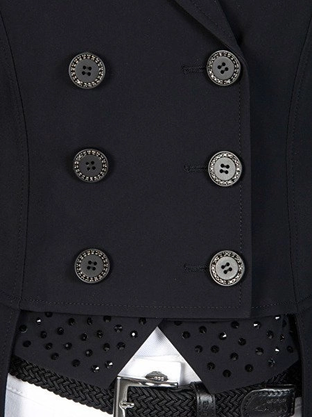 Dodatki: kołnierzyk, klapy fraka oraz pasek z tyłu ozdobione są mieniącymi się błyszczącymi kamieniami. Kamienie są w kolorze fraka. Guziki również są ozdobione błyszczącymi kamieniami.