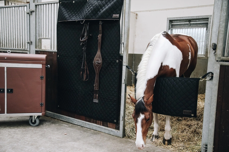 Pod klapą znajduje się pięć praktycznych karabińczyków do mocowania akcesoriów takich jak ogłowia, kantary, wieszak na czapraki lub derki czy hak do czyszczenia sprzętu.