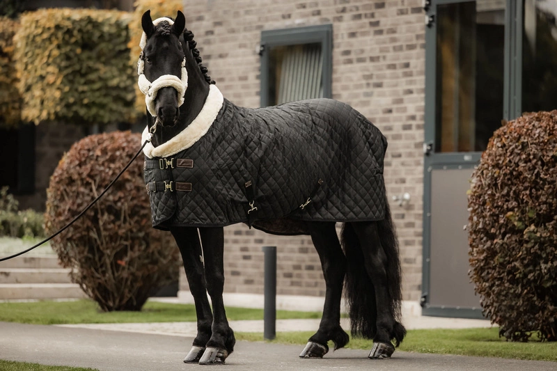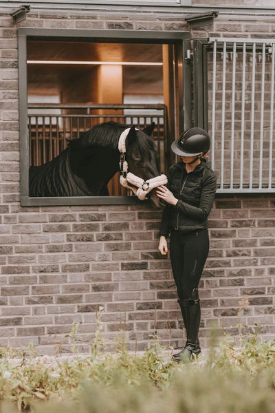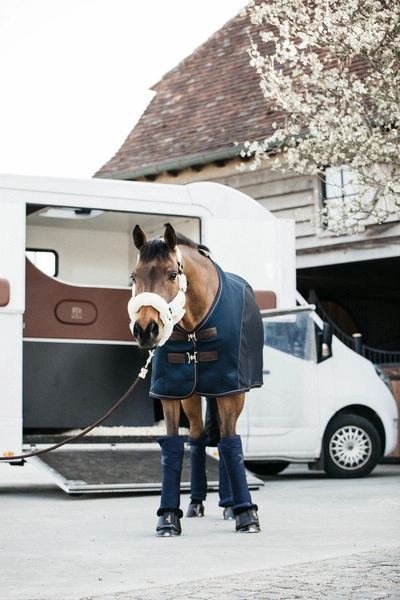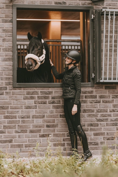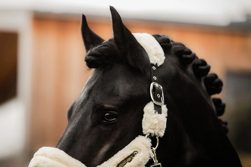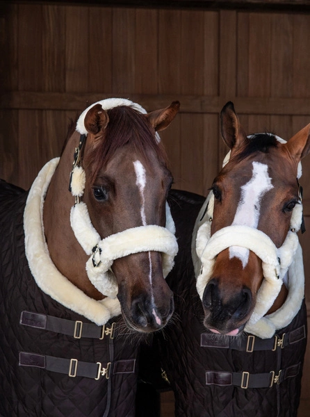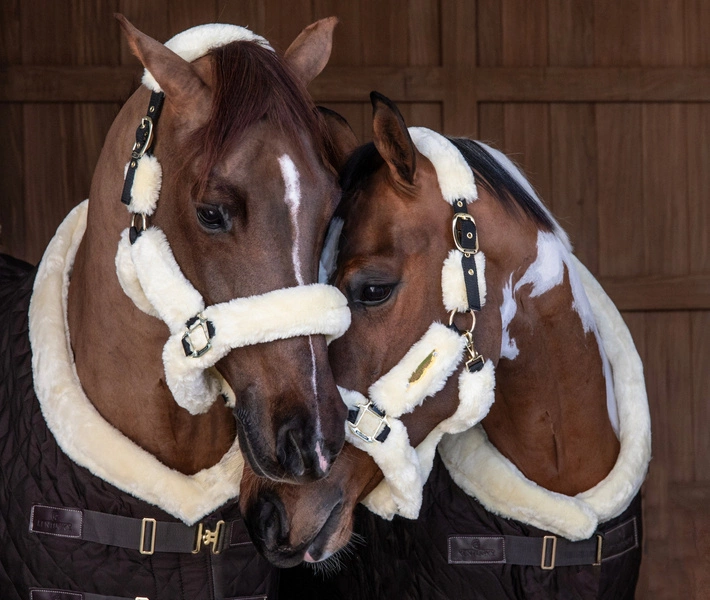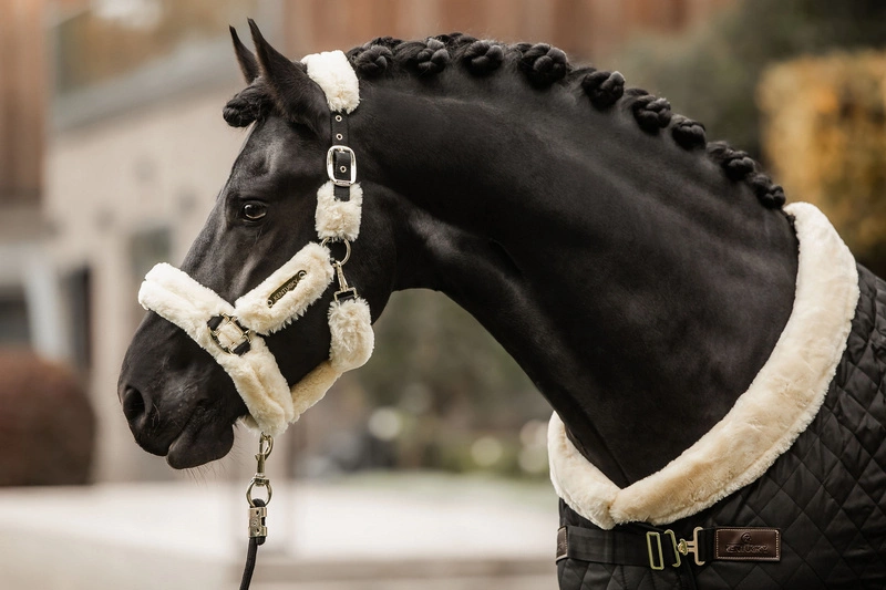 Futro obejmuje cały kantar, nie ma więc żadnego ryzyka obtarcia czy odparzenia nawet podczas wielogodzinnych podróży. Kantar jest wyjątkowo lekki, nigdzie nie uciska, co przekłada się na komfort konia. Zapinany na praktyczny karabińczyk, regulowany w dwóch miejscach na potylicy, co gwarantuje idealne dopasowanie i stabilne, równe położenie.
