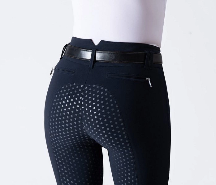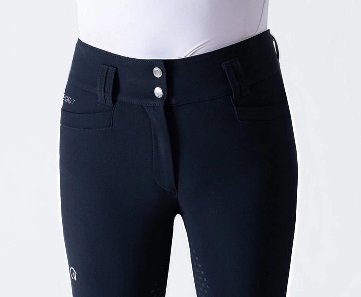 Bryczesy mają wyższy stan i są zapinane na dwa guziczki typu Cobrax (należy je przesunąć, aby je rozpiąć - to typ guzików stworzony z myślą o sporcie).