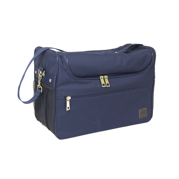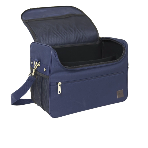 Wnętrze jest regulowane za pomocą mocnych przegródek wpinanych na rzepy. Dzięki temu możesz dowolnie ułożyć wnętrze torby. Główna komora umożliwia przechowywanie pędzli, butelek ze sprayem i innych niezbędnych akcesoriów do pielęgnacji. Po wewnętrznej stronie klapy znajduje się oddzielna kieszeń do przechowywania mniejszych przedmiotów. Z przodu znajduje się duża przegroda, w której można przechowywać przedmioty, takie jak np. gumki go grzywy. Po obu stronach znajdują się elastyczne kieszenie z siatki. Torba zapinana jest na mocny zamek błyskawiczny i wyposażona w odpinany pasek z wyściółką na ramię, co ułatwia jej przenoszenie podczas podróży. Torba jest wzmocniona z boku, co zapewnia jej dodatkową wytrzymałość i zapewnia lepszą ochronę ukrytych w niej preparatów.