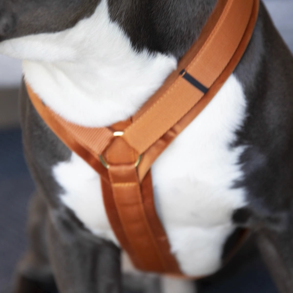Aksamitne wykończenie zapobiega otarciom sierści i równomiernie rozkłada nacisk na klatkę piersiową psa.