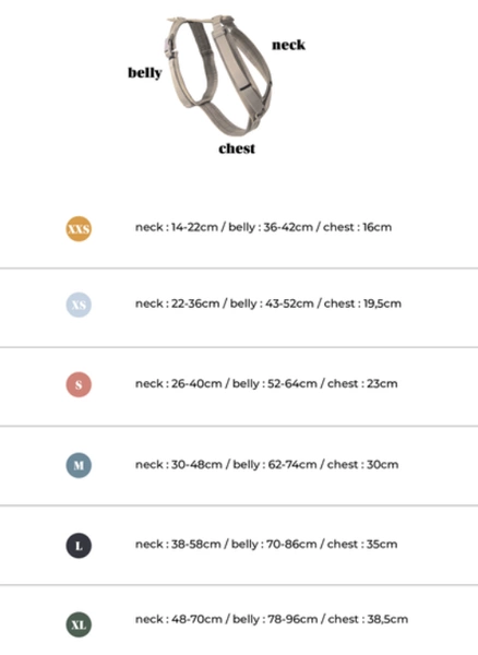 Dostępne są aż w 6 rozmiarach, których opis znajduje się na zdjęciu powyżej. Szelki łatwo dopasować dzięki dodatkowej regulacji.