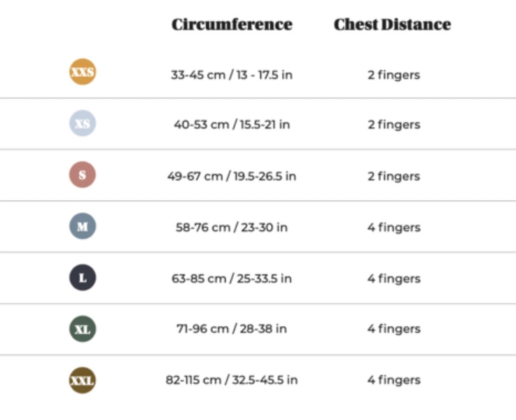 Dostępne są aż w 7 rozmiarach, których opis znajduje się na zdjęciu powyżej. Szelki łatwo dopasować dzięki dodatkowej regulacji.