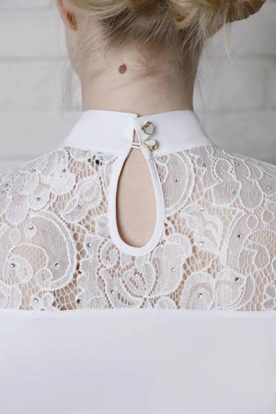 - W górnej części oraz na rękawach ozdobiona jest elastyczną i przyjemną dla skóry koronką gęsto obsypaną mieniącymi się kryształkami Swarovskiego.
