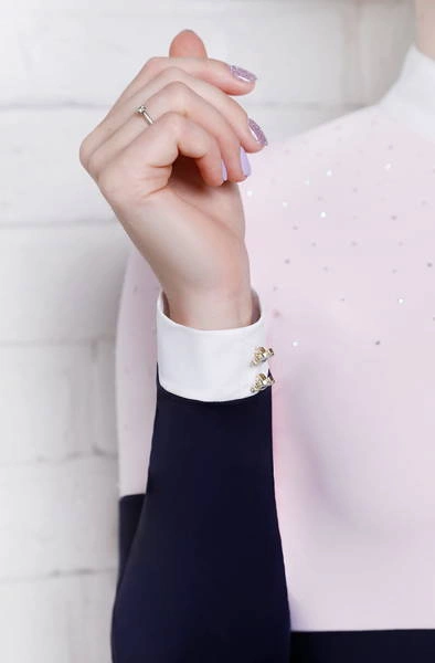 - Peony to dwu-kolorowa koszula konkursowa z długim rękawem w górnej części oraz na rękawach ozdobiona jest gęsto obsypanymi mieniącymi się diamencikami.