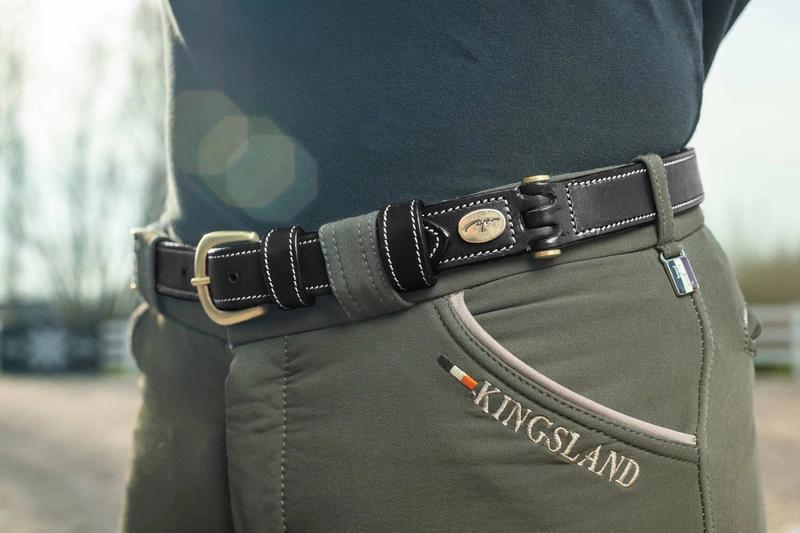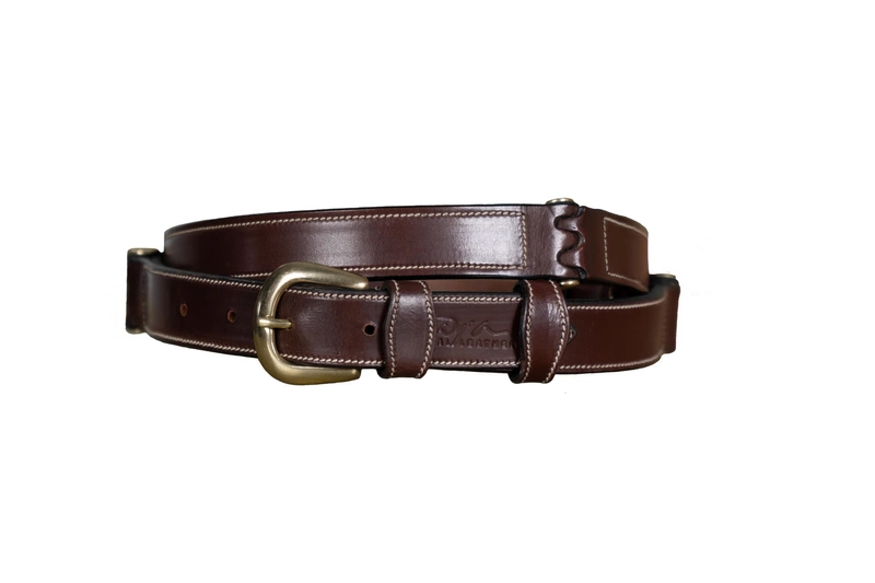 - Przeszyty kremową nitką, ozdobionym tłoczonym logo oraz mosiężną blaszką.